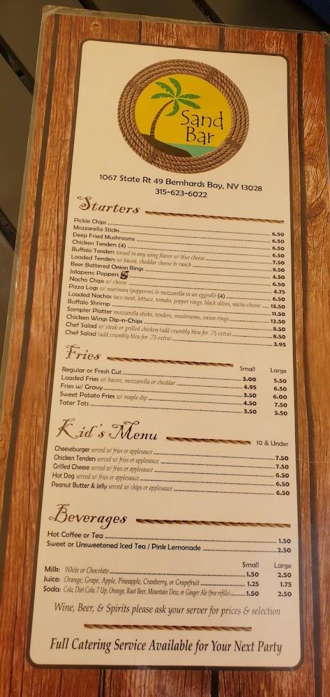 Welcome to Sand Bar & Grill, your go-to spot in Bernhards Bay for delicious meals and vibrant atmosphere! Located at 1067 NY-49, we offer a diverse menu featuring local specialties, excellent cocktails, and a wide selection of beers. Enjoy your meal on our outdoor terrace or opt for takeaway and late-night dining options. With quick service, quiz nights, and live entertainment, we create an engaging experience for all. Our venue is accessible and perfect for solo diners or groups alike. Join us for breakfast, lunch, or dinner, and experience the best of casual dining!